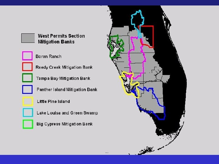 Fundamental Requirements of Mitigation Banks § Will be adjacent to lands that will not harm the § § § viability of the mitigation bank due to unsuitable land uses or conditions Will operate in accordance with State and Federal law Applicant can legally and financially ensure perpetual management of the land Can meet the financial responsibility requirements prescribed for mitigation banks