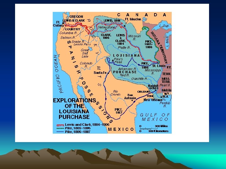 Zebulon Pike Expedition • 1805 -1806 – traveled from St. Louis north to the headwaters of the Mississippi River in Minnesota • 1806 -1807 – traveled west from St. Louis into Colorado. Found Pike’s Peak. Then traveled south to Santa Fe • Collected information about this territory