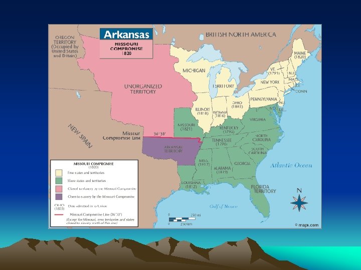 Missouri Compromise, 1820 • Missouri – 1 st La. Purch territory to apply for statehood – Tallmadge Amendment – James Tallmadge (NY rep) tried to amend the bill… • Established the 36* 30’ line • Significance – Temporary fix to slave v. free territory question related to expansion