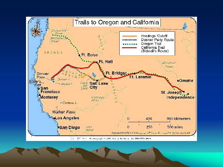 Go West, Young Man! • Settlers followed specific trails west as to not lose their way • The Oregon Trail headed northwest along the Platte and Snake Rivers, took people to Portland • California Trail went near San Francisco