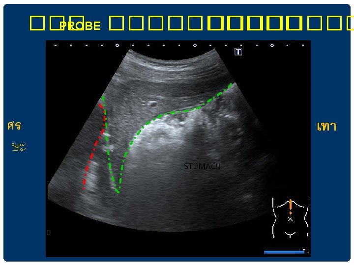 THE GALLBLADDER • อยใต interlobar fissure • ใชเปน landmark for identifying the junction between the left and right lobes of the liver • งดนำงดอาหาร ประมาณ 4 -6 ชวโมง adequate gallbladder distention + reduce upper abdominal bowel gas
