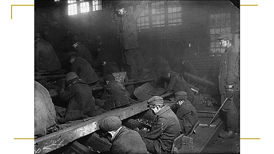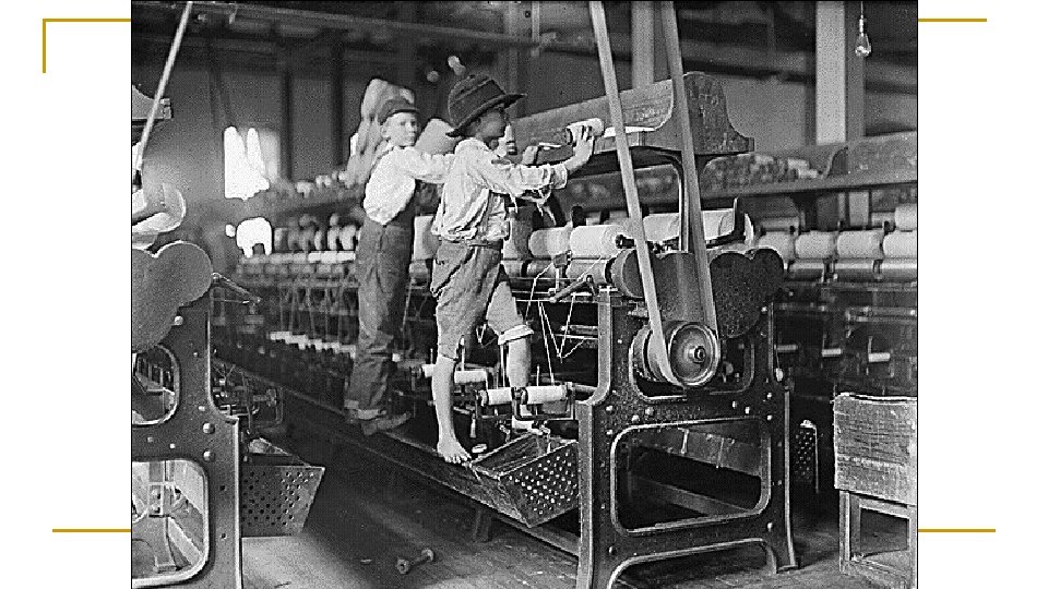 Factory Conditions Many women & children employed q Long hours (12 -14 hrs/day, 6 days/week) & low wages q Poor working conditions – bad lighting, poor ventilation, unsafe machinery q Led to the formation of the first labor unions q