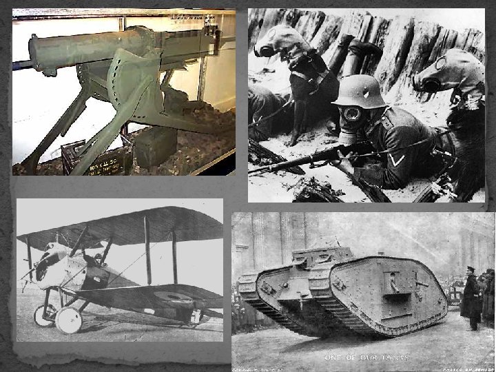 New Technology ● Machine gun ● Rapid fire weapon capable of firing 600 rounds a minute ● Airships and airplanes ● Used to transport goods ● Used in air battles or “dogfights” ● Planes could also carry and drop bombs on targets ● Tanks ● Heavy armor could travel through barbed wire ● Powerful; shots could destroy buildings ● Poison Gas (Mustard Gas)- because of its color ● Used to blind, sicken and suffocate victims ● Result was gas masks became part of standard equipment ● Anti-aircraft gun ● Used to shoot down planes