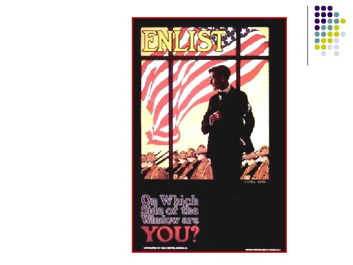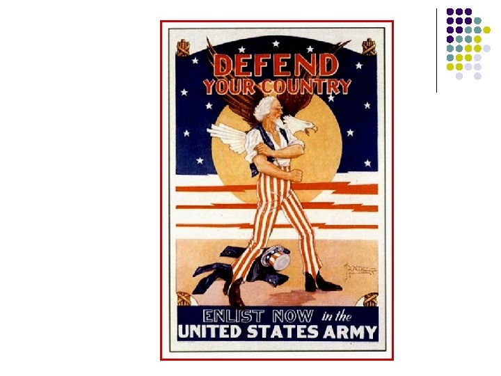 Propaganda in the War l l Government created Committee on Public Information—headed by George Creel. Goal—to sell the war to America and convince the world of the righteousness of Wilson’s war aims. 4 -minute men, posters, movies, songs Anti-Germanism on the rise