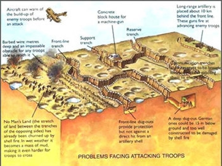• Trench warfare was the main reason for lengthy, bloody battles which gained little to no land. • Soldiers endured months of hardships in the trenches including: Lice, rats, disease and starvation. • “Going over the top” and attacking the other trenches lead to millions of deaths and very little gains.