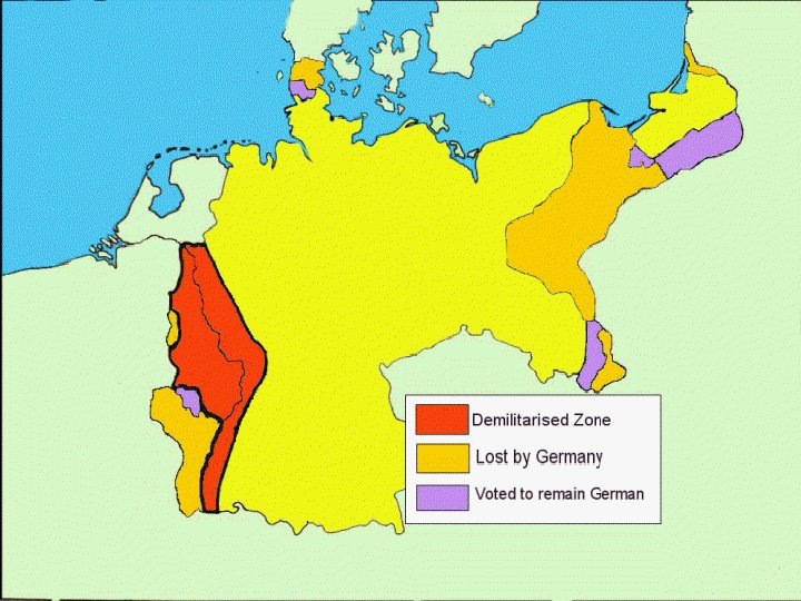 General Clauses • War Guilt Clause - Germany to accept blame for starting the war. • The establishment of the League of Nations. Financial Clauses • Reparations - Germany was to pay for the damage caused by the war. The figure of £ 6, 600 million was set some time after the signing of the treaty. Military Clauses • Army - was to be reduced to 100, 000 men and no tanks were allowed. • Navy - Germany was only allowed 6 ships and no submarines. • Air force - Germany was not allowed an air force. • Rhineland - The Rhineland area was to be kept free of German military personnel and weapons. Territorial Clauses • ‘Anschluss’ - Germany was not allowed to unite with Austria.