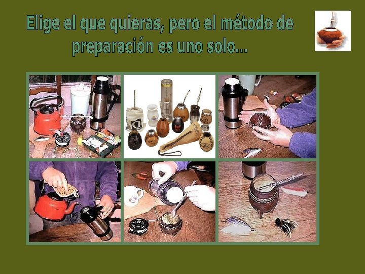 Llenar el mate con tres cuartas partes de yerba. El nivel debe ser justo, ya que es tan malo que el mate tenga mucha como poca yerba. Cubrir la boca del mate, invertirlo y agitarlo varias veces para distribuir la yerba. Así los componentes más gruesos de la molienda se ubicarán al fondo, colaborando con el filtro de la bombilla y evitando que ésta se tape. Al volver a poner el mate boca arriba, cuidar que la yerba quede inclinada a 45º aproximadamente, de manera que se forme una cavidad en uno de los Cubrir la boca del mate, costados. Humedecerla con una pequeña cantidad de agua tibia, y luego repetir la operación con agua más caliente. invertirlo y agitarlo varias veces para distribuir la yerba. Así los componentes más gruesos de la Esperar que la yerba absorba el agua y recién entonces introducir la ubicarán al fondo, bombilla en el área humedecida de maneramolienda quedese firme y colaborando con el filtro de la recostada contra la pared del mate. bombilla y evitando que ésta se Cebar con agua a una temperatura de entretape. 70 y 80º centígrados, nunca hirviendo…