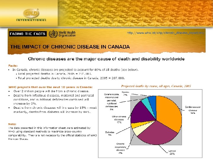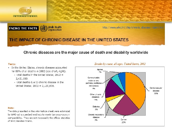 Chronic Disease Report: “Chronic disease causes 2 X deaths from all infectious diseases” • 35 million death / year today (60%)! • 41 million by 2015……. . a 17% INCREASE. WE’RE LOSING THIS BATTLE!
