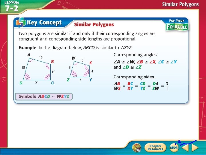 Identify Similar Polygons B. MENUS Tan is designing a new menu for the restaurant where he works. Determine whether the size for the new menu is similar to the original menu. If so, write the similarity statement and scale factor. Explain your reasoning. Original Menu: New Menu: