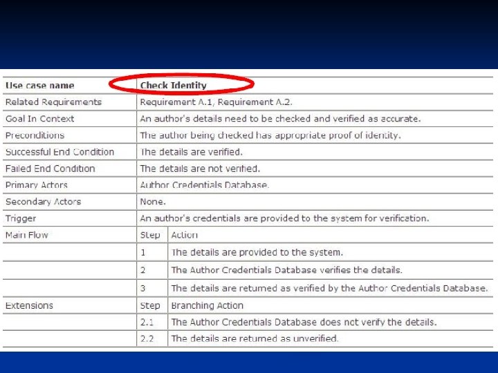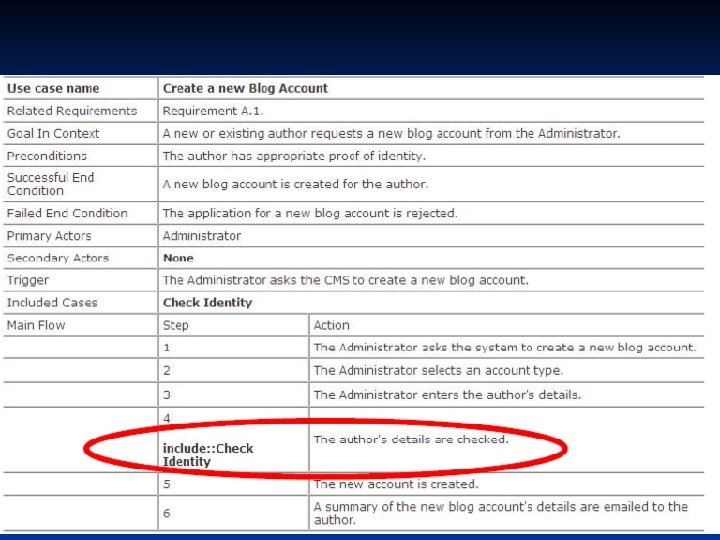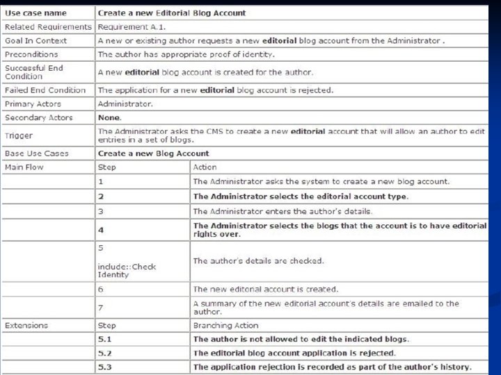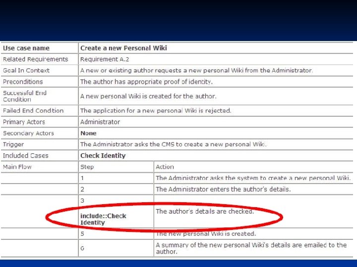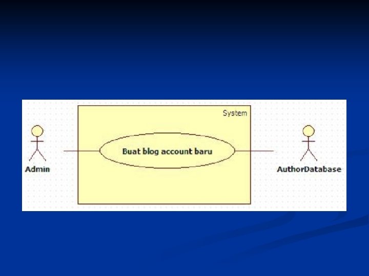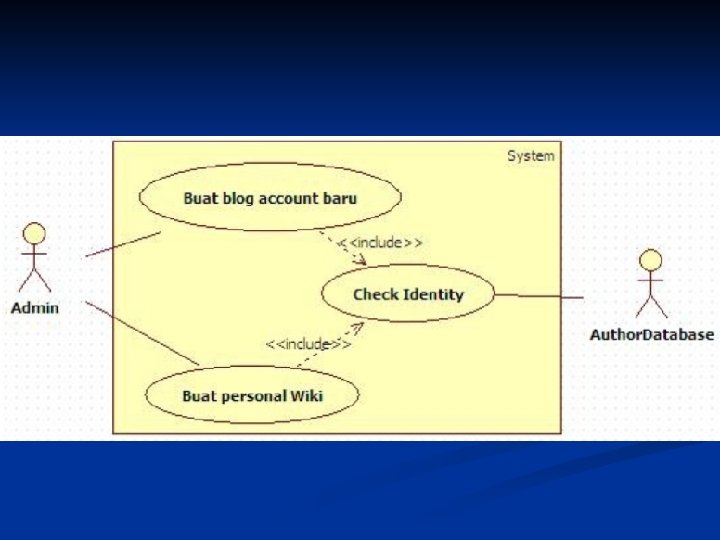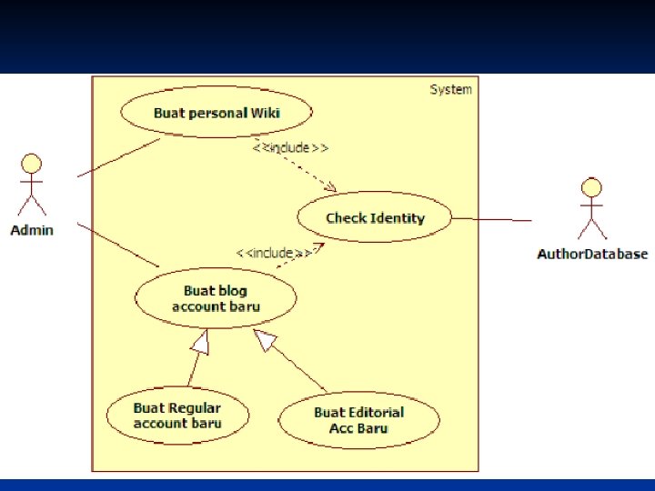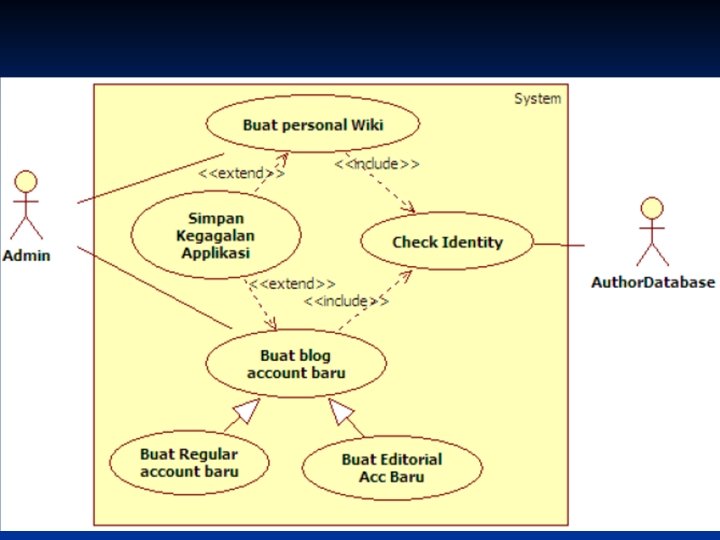 Hubungan Use Case n n Hubungan antar use case lebih ditekankan pada penguraian perilaku sistem kedalam sesuatu yang mudah diatur, daripada menambah baru. Contoh (Req. A. 2) n n CMS harus membolehkan administrator untuk membuat personal Wiki baru, penyediaan informasi rinci penulis diuji menggunakan database author. Dalam blog, CMS punya sejumlah cara untuk bekerja dengan isinya. Satu mekanisme yang populer untuk pemeliharaan dokumen adalah dengan Wiki memungkinkan penulis secara online membuat, mengubah dan menyambungkan bersama-sama halaman web (Wikiweb)