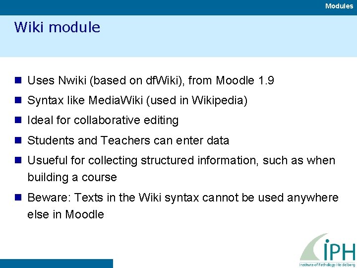 Modules Wiki module n Uses Nwiki (based on df. Wiki), from Moodle 1. 9 n Syntax like Media. Wiki (used in Wikipedia) n Ideal for collaborative editing n Students and Teachers can enter data n Usueful for collecting structured information, such as when building a course n Beware: Texts in the Wiki syntax cannot be used anywhere else in Moodle