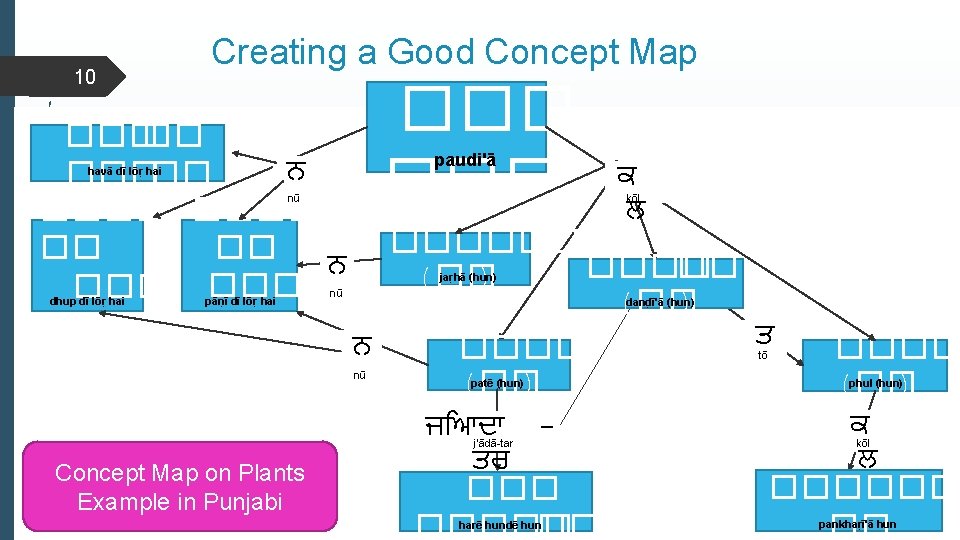 Creating a Good Concept Map 9 Air Sunlight Plants have need Water need Roots need Leaves Concept Map on Plants Example in English Stems modified to form Flowers are usually have Green Petals