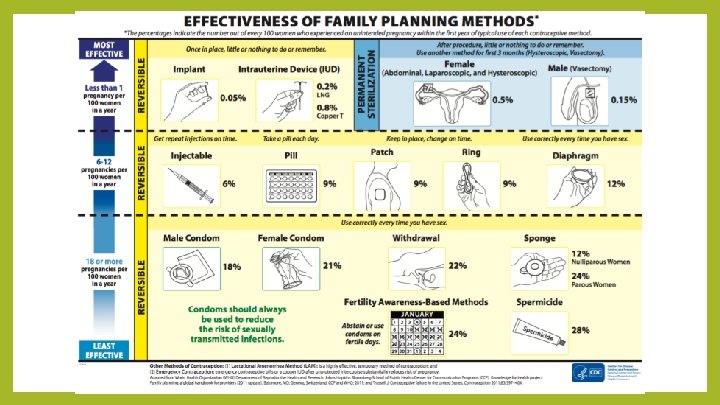 Method Pros Cons Non-Hormonal IUD Regular menses continues May increase menstrual bleeding and cramps Risk of perforation: 1/1000 Risk of expulsion: 2 -10/100 Not use if allergy copper or Wilson’s Hormonal IUD Reduces heavy menstrual bleeding (on average by 90%) menses may cease; decrease cramps No weight gain May decrease endometriosis Can be used if can’t take estrogen Irregular bleeding Risk of perforation: 1/1000 Risk of expulsion: 2 -10/100 Rare: breast tenderness, acne, headaches Cannot be used if hx breast cancer or severe liver disease Implant Reduces heavy menstrual bleeding; menses may cease (1 in 3 women); decrease cramps Can be used if can’t take estrogen Cannot be used if history breast cancer or severe liver disease Irregular bleeding Rare: infection at site, headaches, nausea, breast tenderness https: //www. plannedparenthood. org/learn/birth-control