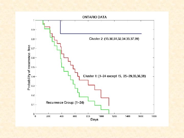 Expression Profiles for Useful Metagenes (Ontario 39 Tissues) Gene Group 1 Gene Group 2 Log Expression Value Our Tissue Cluster 1 Our Tissue Cluster 2 Recurrence (1 -24) Censored (25 -39) Gene Group 19 Gene Group 20 Tissues