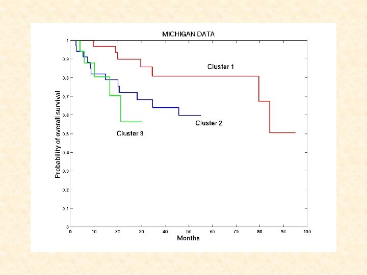Survival Analysis for Michigan Dataset • Kaplan-Meier estimation: Cluster No. of Tissues No. of Censored Mean time to Failure ( SE) 1 2 3 34 35 17 27 23 12 84. 1 7. 3 73. 5 8. 5 41. 7 7. 8 No significant difference in survival between clusters • Long-term survivor model: Estimates (SE) S 1(t) (Weibull distribution) a : 0. 017 (0. 007); b : 1. 116 (0. 215) p 2 (Logistic function) -0. 712 (0. 218); 0. 654 (0. 169); 0. 723 (0. 702) A significant difference in p 2 between Clusters 1 & 2 Proportion of long-term survivors Cluster 1 Cluster 2 Cluster 3 67. 1% 51. 5% 34. 0%