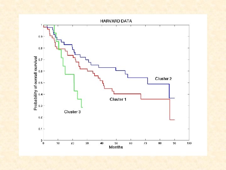 Survival Analysis for Harvard Dataset • Kaplan-Meier estimation: Cluster 1 2 3 No. of Tissues No. of Censored 54 47 14 Mean time to Failure ( SE) 50. 9 5. 8 62. 2 5. 7 26. 5 4. 7 22 25 4 A significant difference in survival between clusters (P=0. 044) • Cox’s proportional hazards analysis: Variable Cluster 2 vs. Cluster 1 Cluster 3 vs. Cluster 2 Age Female vs. Male Smoking frequency Tumor size Presence of tumor in lymph nodes Stage Hazard ratio (95% CI) P-value 0. 74 (0. 4 – 1. 4) 3. 08 (1. 4 – 6. 8) 1. 02 (1. 0 – 1. 1) 0. 56 (0. 3 – 1. 0) 1. 24 (0. 6 – 2. 5) 1. 68 (0. 9 – 3. 3) 2. 50 (1. 3 – 4. 8) 1. 43 (0. 7 – 2. 9) 0. 34 0. 005 0. 12 0. 06 0. 54 0. 13 0. 006 0. 33