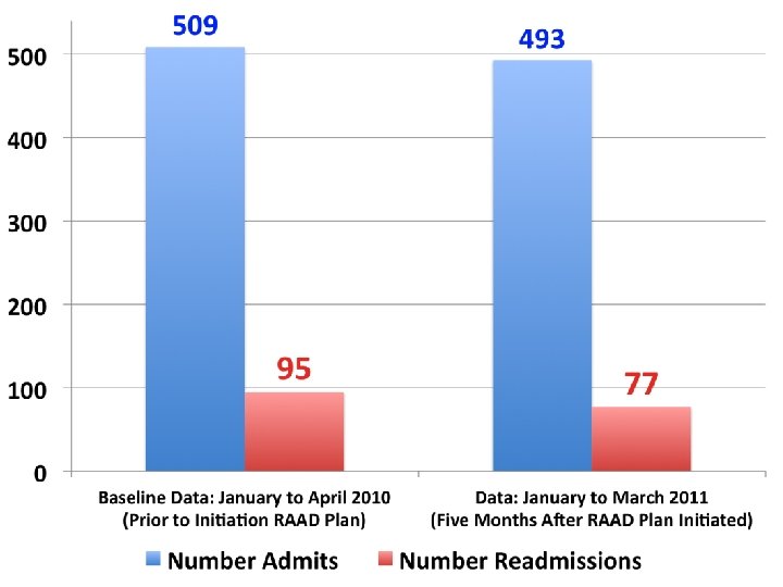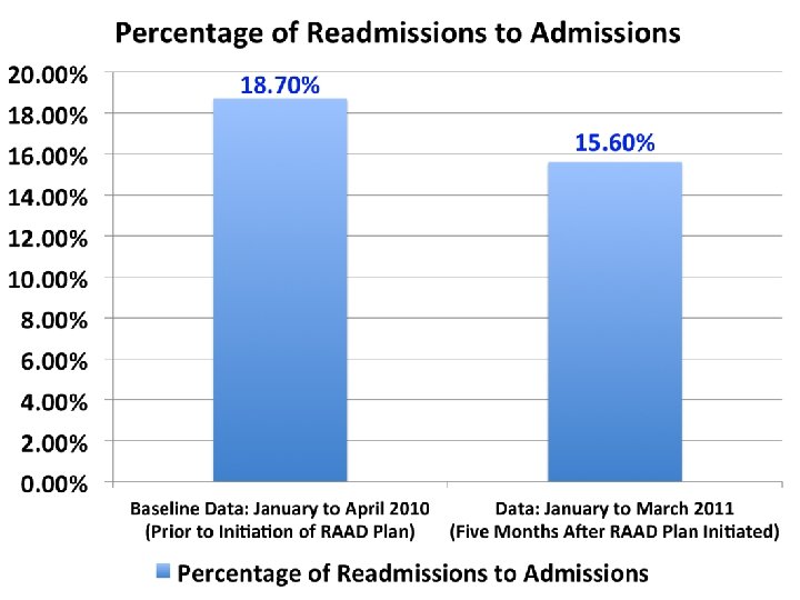 Final Thoughts • Baseline data obtained from unplanned admissions from January to April 2010 prior to the initiation of the RAAD Plan gives a percentage of readmissions to admissions of 18. 7%. • Data obtained from unplanned admissions from January to March 2011 five months after the initiation of the RAAD Plan gives a percentage of readmissions to admissions of 15. 6%. 61