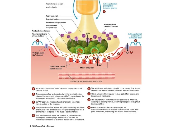 Axon of motor neuron Myelin sheath Axon terminal Terminal button Vesicle of acetylcholine Acetylcholine receptor site Action potential propagation in motor neuron Voltage-gated calcium channel Acetylcholinesterase Plasma membrane of muscle fiber Action potential propagation in muscle fiber Ca 2+ Na+ Voltage-gated Na+ channel K+ Na+ Chemically gated cation channel Motor end plate Contractile elements within muscle fiber