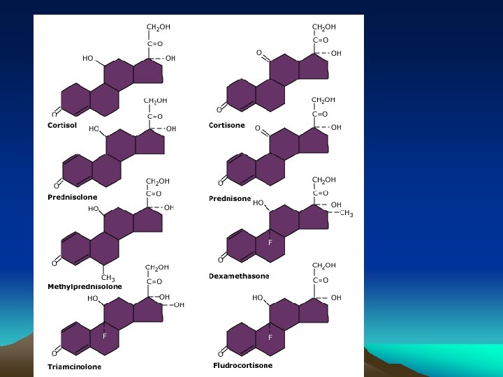 Synthetic steroids • Glucocorticoids – Prednisolone/ prednisone – Methylprednisolone – Dexamethasone – Betamethasone – triamcinolone • Mineralocorticoid – Aldosterone – Fludrocortisone