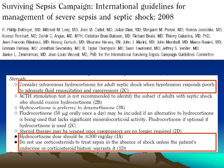 • Included total 499 patients – All with septic shock and remained hypotensive or required treatment with vasopressors for at least 1 hour after adequate fluid resuscitation • Study group – Hydrocortisone 50 mg Q 6 H for 5 days, then tapered during a 6 days period