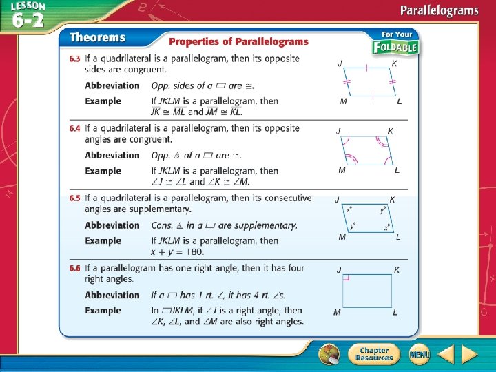 Use Properties of Parallelograms and Algebra A. If WXYZ is a parallelogram, find the value of r. Opposite sides of a parallelogram are . Definition of congruence Substitution Divide each side by 4. Answer: r = 4. 5