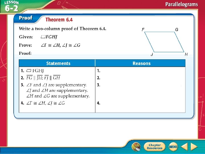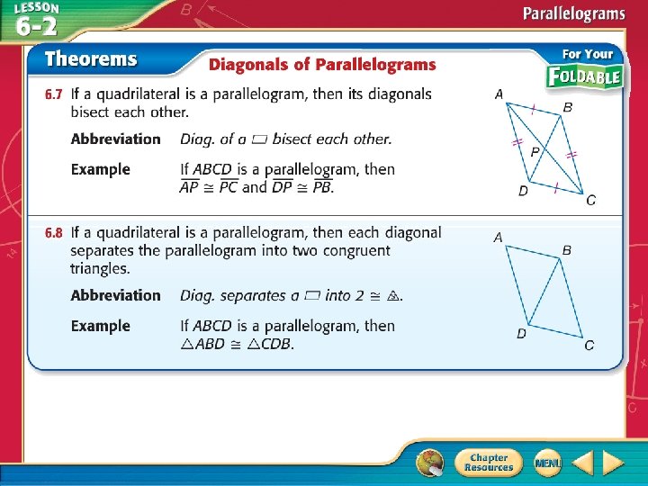 Proofs Using the Properties of Parallelograms Write a paragraph proof. Given: are diagonals, and point P is the intersection of Prove: AC and BD bisect each other. Proof: ABCD is a parallelogram and AC and BD are diagonals; therefore, AB║DC and AC is a transversal. BAC DCA and ABD CDB by Theorem 3. 2. ΔAPB ΔCPD by ASA. So, by the properties of congruent triangles BP DP and AP CP. Therefore, AC and BD bisect each other.