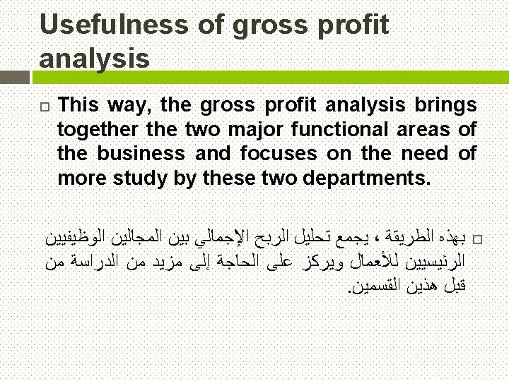 Usefulness of gross profit analysis The gross profit analysis uncovers inefficiencies in company’s performance during the period and enables management to take remedial actions to correct the situation. ﻳﻜﺸﻒ ﺗﺤﻠﻴﻞ ﺍﻟﺮﺑﺢ ﺍﻹﺟﻤﺎﻟﻲ ﻋﻦ ﺃﻮﺟﻪ ﺍﻟﻘﺼﻮﺭ ﻓﻲ ﺃﺪﺍﺀ ﺍﻟﺸﺮﻛﺔ ﺧﻼﻝ ﺍﻟﻔﺘﺮﺓ ﻭﻳﻤﻥ ﺍﻹﺩﺍﺭﺓ ﻣﻦ . ﺍﺗﺨﺎﺫ ﺇﺟﺮﺍﺀﺍﺕ ﻋﻼﺟﻴﺔ ﻟﺘﺼﺤﻴﺢ ﺍﻟﻮﺿﻊ