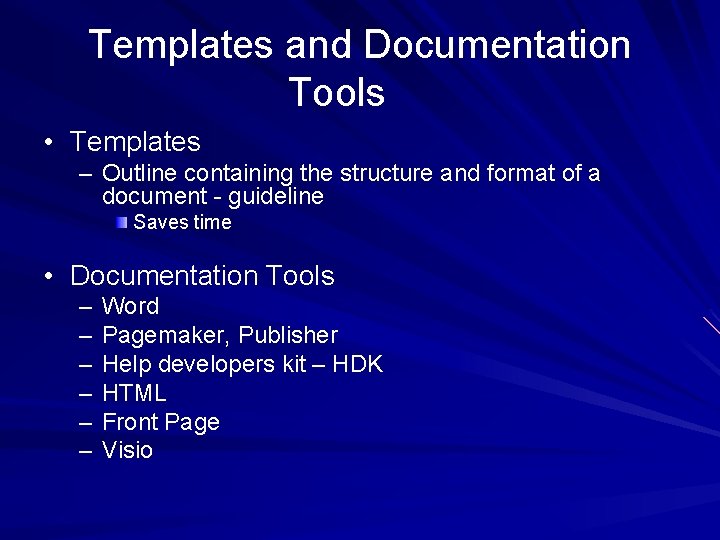 Templates and Documentation Tools • Templates – Outline containing the structure and format of a document - guideline Saves time • Documentation Tools – – – Word Pagemaker, Publisher Help developers kit – HDK HTML Front Page Visio