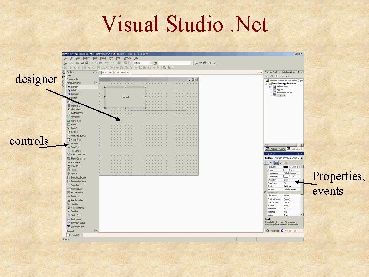 Adding GUI Controls public class My. Form 1 : System. Windows. Form { private System. Windows. Forms. Button button 1; … // member variables for each GUI control private void Initialize. Component( ) // VS auto-generated GUI code // create GUI controls: this. button 1 = new System. Windows. Forms. Button( ); // set properties of GUI controls: this. button 1. Text = "button 1"; // add controls to their parent or Form: this. Controls. Add. Range( new System. Windows. Forms. Control[] {this. button 1} ); }