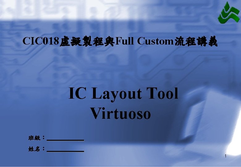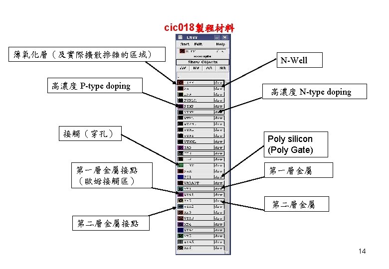 0. 2 um PIMP W =1 um 可按快速鍵I,找尋example > cont > layout,即可找到cont。 0. 2 um 0. 03 um 0. 2 um 加入NIMP、PIMP 參雜完成完整的N、 PMOS佈局。 完成N、PMOS佈局 並將Gate端串接 0. 03 um 0. 2 um 佈上cont後即完成單一顆MOS佈局 NIMP W =0. 5 um 0. 2 um 19