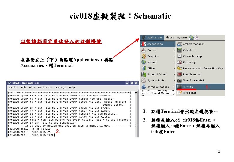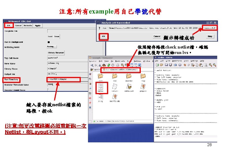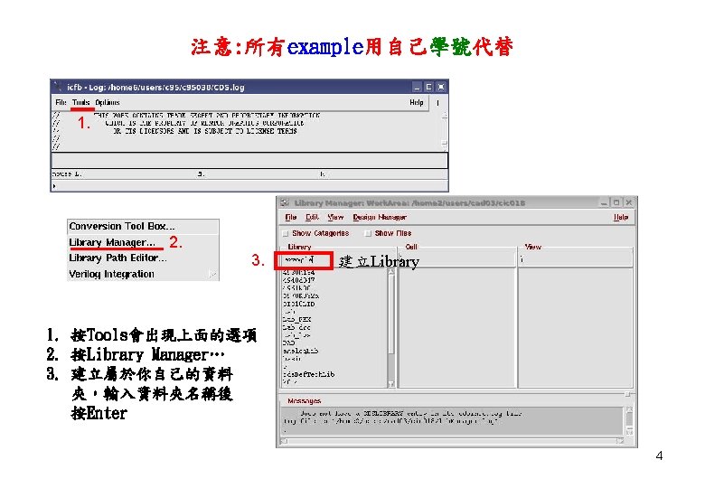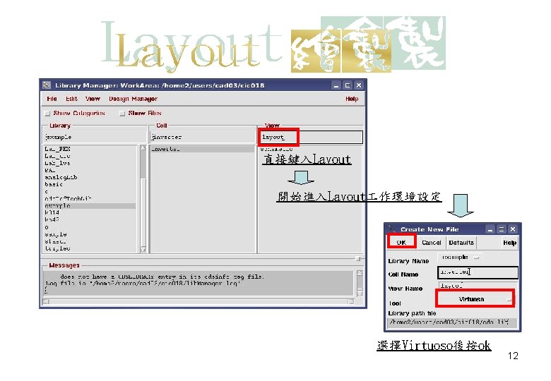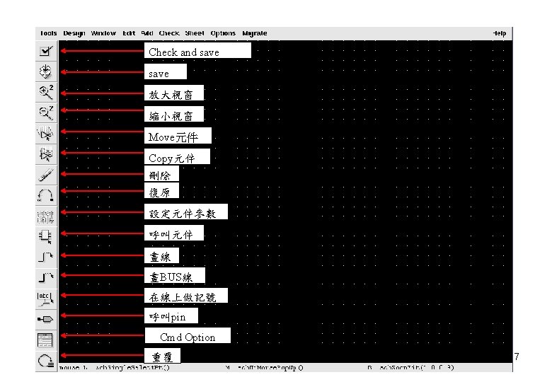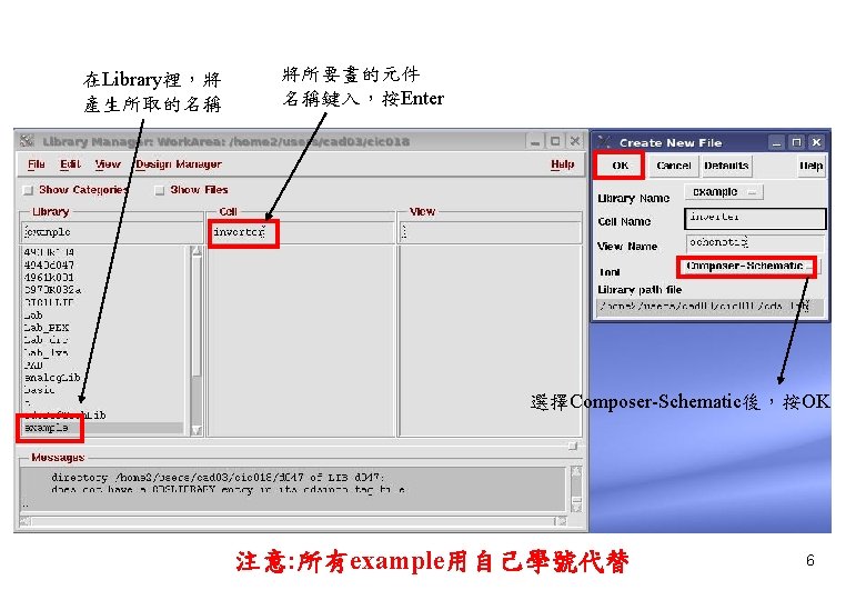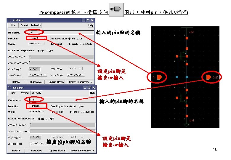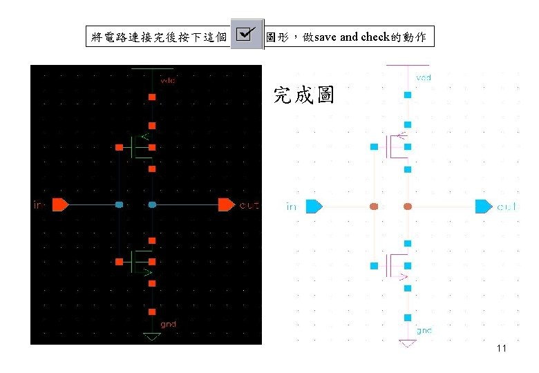 PMOS的參數設定與NMOS參數設定步驟雷同 全部設定完後點選Hide 設定Width與Length (W/L)p=1000 nm/180 nm,(W/L)n=500 nm/180 nm 1000. 00 n M analog. Lib中可以輸入所需的元件如: Vdd、gnd 選好檔案後點選Close 9