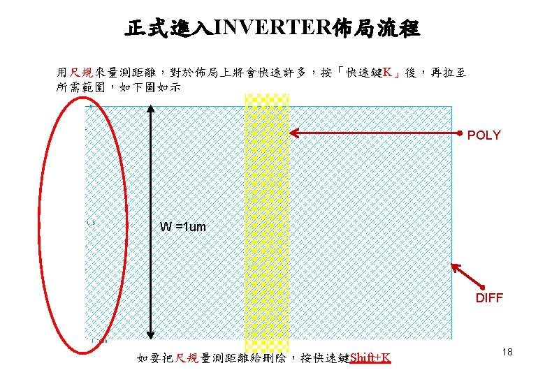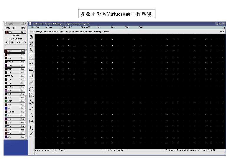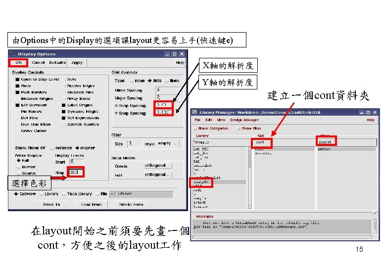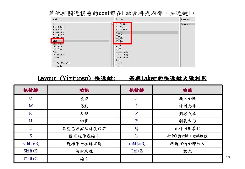接著怖上DIFF與ME 1,CONT就完成了。 0. 125 um 首先先畫一個0. 23 um*0. 23 um 的CONT 0. 23 um 0. 125 um 可按快速鍵I, 找尋example > cont > layout,即可找到cont。 0. 125 um 16