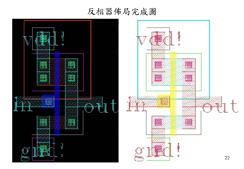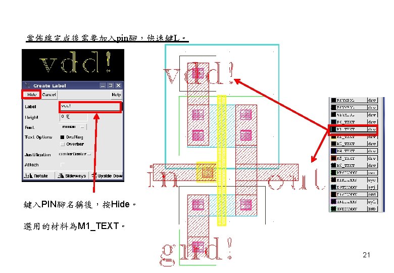 0. 25 um NWELL PMOS要加入NWELL,在製作晶片 時利於辨認。 0. 1 um 用Metal 1佈線與加入適當的cont (VDD、GND、Poly_M 1)連接。 0. 5 um 0. 1 um 20