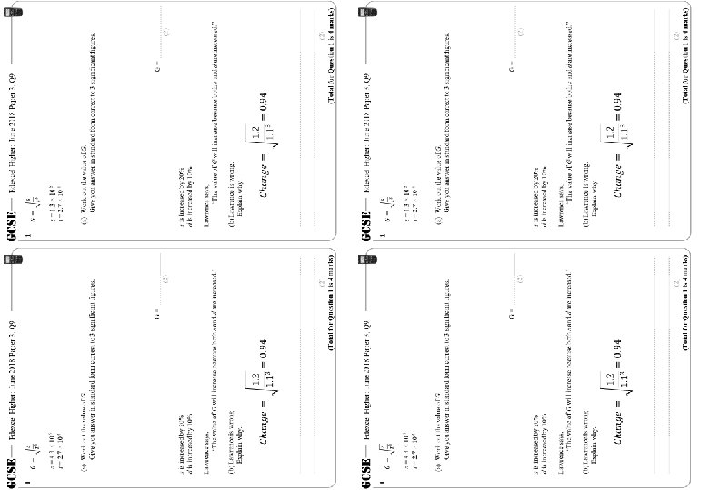 GCSE Edexcel Higher: June 2018 Paper 3, Q 9 1 s = 4. 3 × 10 -5 t = 2. 7 × 10 -4 (a) Work out the value of G. Give you answer in standard form correct to 3 significant figures. G= (2) s is increased by 20% d is increased by 10% Lawrence says, “The value of G will increase because both s and d are increased. ” (b) Lawrence is wrong. Explain why. (2) (Total for Question 1 is 4 marks)