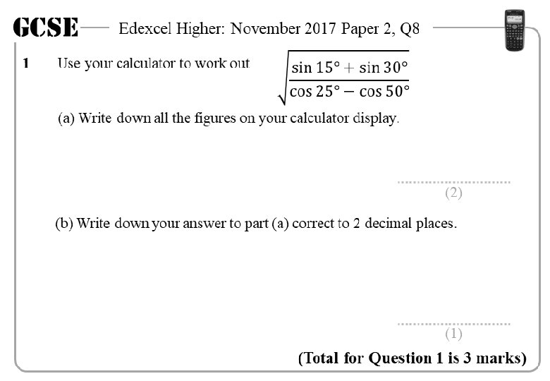 GCSE 1 Edexcel Higher: November 2017 Paper 2, Q 8 Use your calculator to work out (a) Write down all the figures on your calculator display. 1. 696923149 (2) (b) Write down your answer to part (a) correct to 2 decimal places. 1. 696923149 1. 70 (1) (Total for Question 1 is 3 marks)