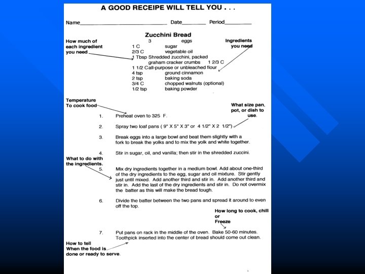 Recipes go wrong when: (Continued) n n n Your forget one ingredient. You use the wrong substitution for another ingredient. You divided the recipe wrong. You fail to blend ingredients at the correct temperature. You don’t used a tested recipe. You add something and then your lab partner adds it again.