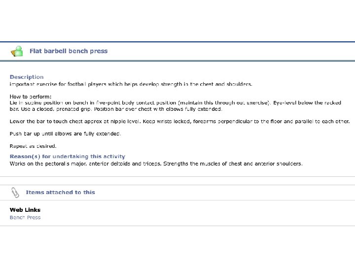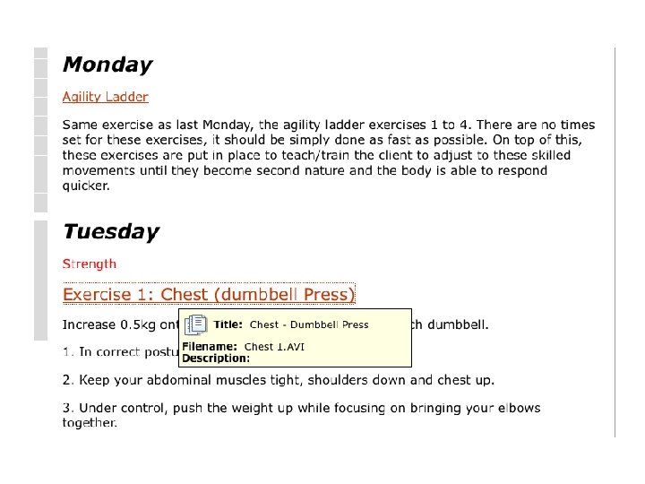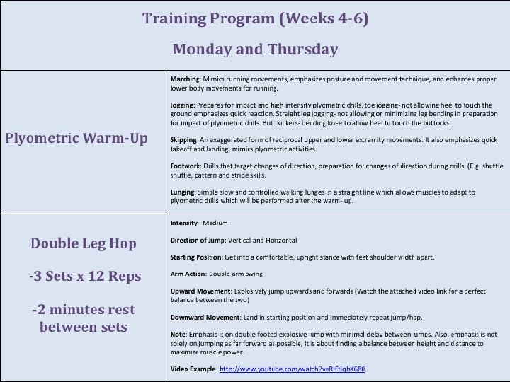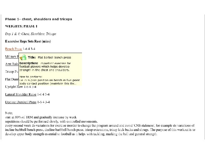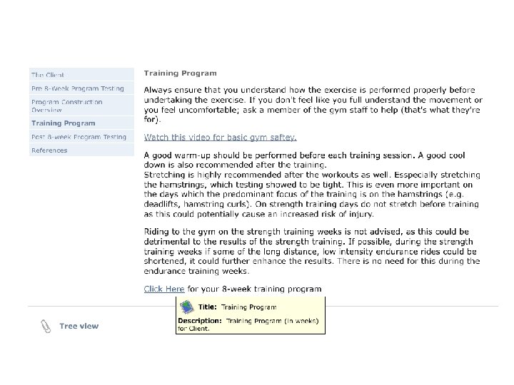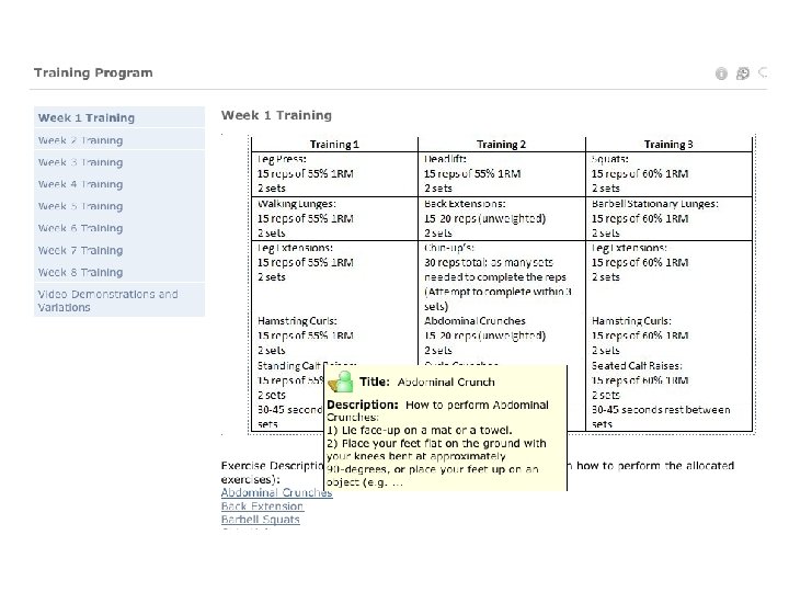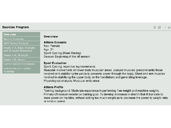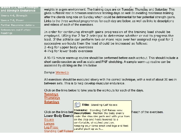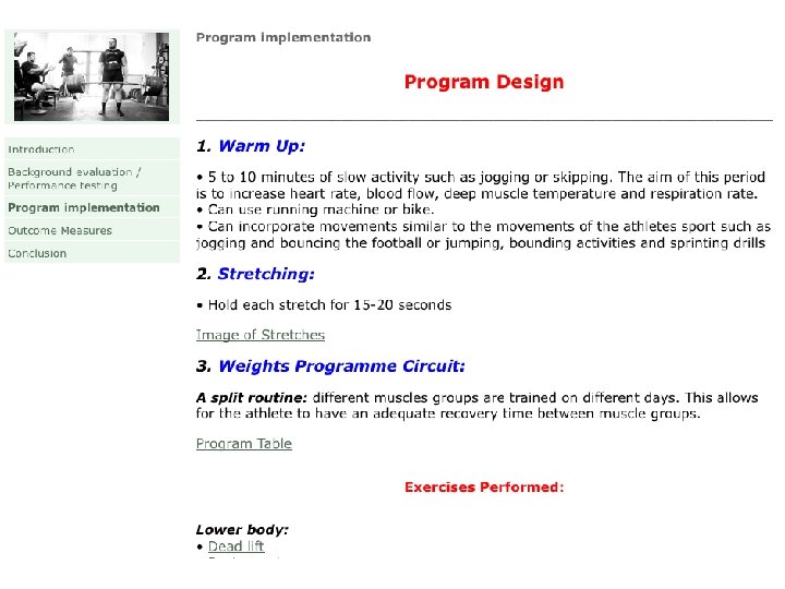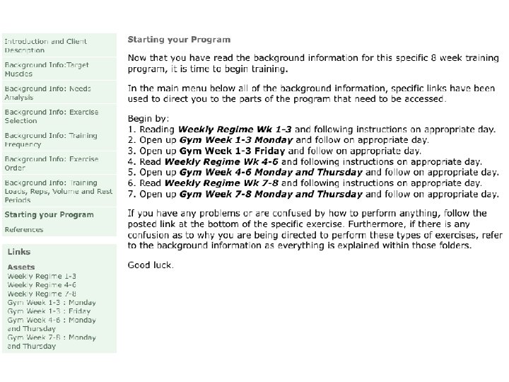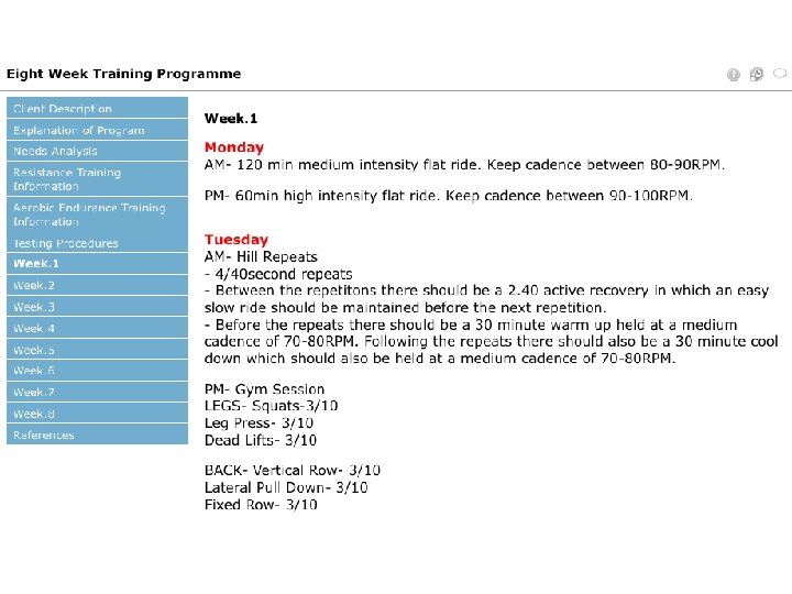 Presentation each week set up as separate web page program – separate webfolio within webfolio program broken up into groups of weeks program designed as series of phases plan presented in 1 table with descriptions of the different programs 9