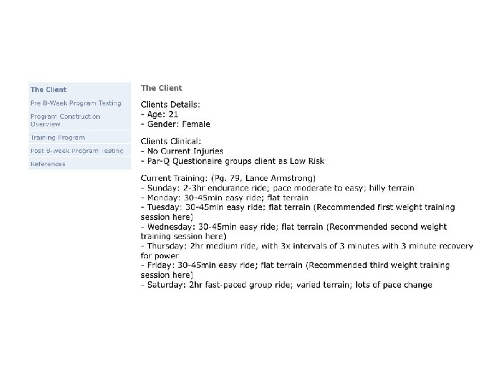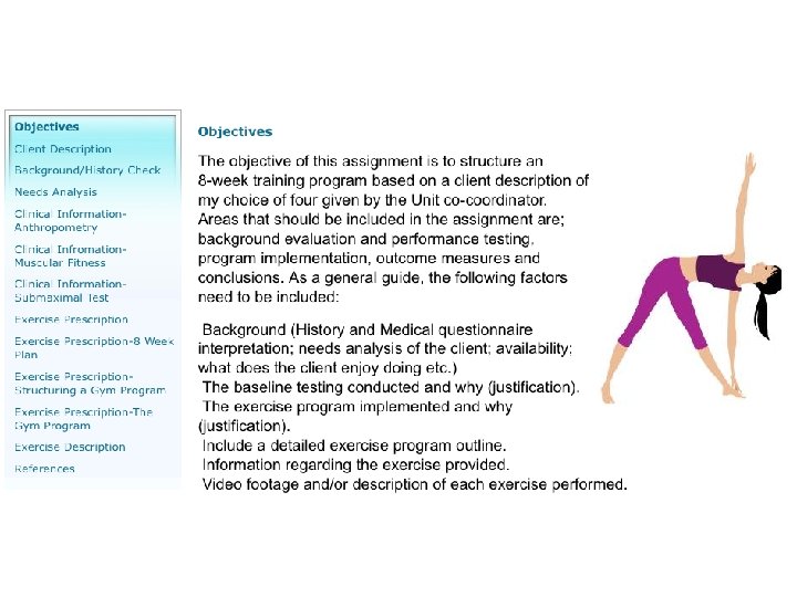 Assignment Structure an 8 week training program for a “client” Program to include: - information and video footage and/or a description of each exercise to be performed - alternative exercises and variations within the training program 6