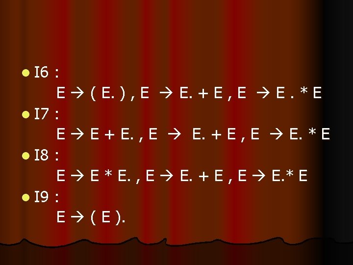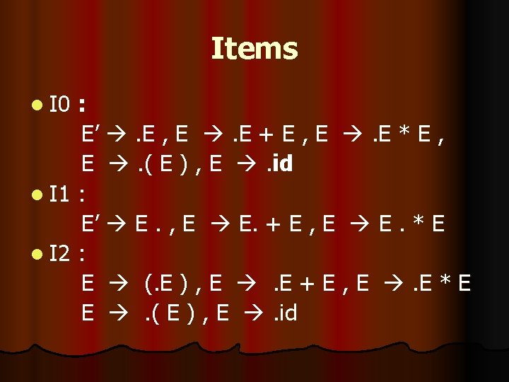 l First(E’) – { ( , id } l First(E) – { ( , id } l Follow(E’) –{$} l Follow(E) –{+, *, ), $}