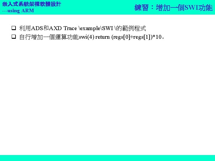 嵌入式系統架構軟體設計 ---using ARM Identify SWI q When a SWI handler is entered, it must establish which SWI is being called. Load the SWI instruction that cause the exception. • LDR r 0, [lr, #-4] Extract the SWI number by clearing the 31 -24 bits. • BIC r 0, #0 x. FF 000000