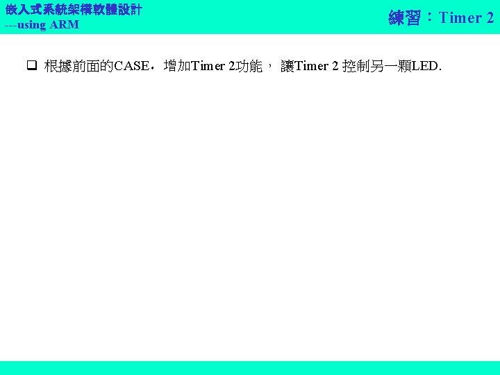 嵌入式系統架構軟體設計 ---using ARM Case Study: Build An Image for Wiscore EVM q Application: 7 -segment LED test Set up Timer 0: Interrupt to flash LED 0 While loop detect switch & change 7 -segment LED number