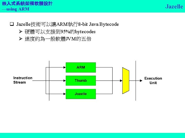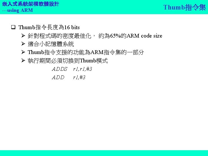 嵌入式系統架構軟體設計 ---using ARM/Thumb Interworking Function Call q Use BX or BLX q BX does not store return address in LR automatically. -> return from function by BX LR to original state. q v 5 T supports BLX