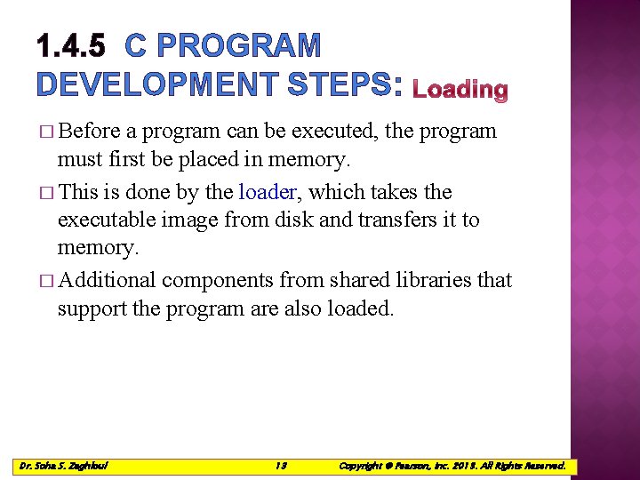 1. 4. 5 C PROGRAM DEVELOPMENT STEPS: � Before a program can be executed, the program must first be placed in memory. � This is done by the loader, which takes the executable image from disk and transfers it to memory. � Additional components from shared libraries that support the program are also loaded. Dr. Soha Copyright S. Zaghloul© Pearson, Inc. 2013. All Rights Reserved. 13 Copyright © Pearson, Inc. 2013. All Rights Reserved.