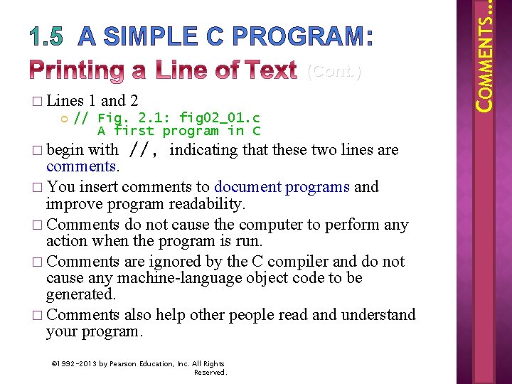 (Cont. ) � Lines 1 and 2 // Fig. 2. 1: fig 02_01. c A first program in C � begin with //, indicating that these two lines are comments. � You insert comments to document programs and improve program readability. � Comments do not cause the computer to perform any action when the program is run. � Comments are ignored by the C compiler and do not cause any machine-language object code to be generated. � Comments also help other people read and understand your program. © 1992 -2013 by Pearson Education, Inc. All Rights Reserved. COMMENTS 1. 5 A SIMPLE C PROGRAM: