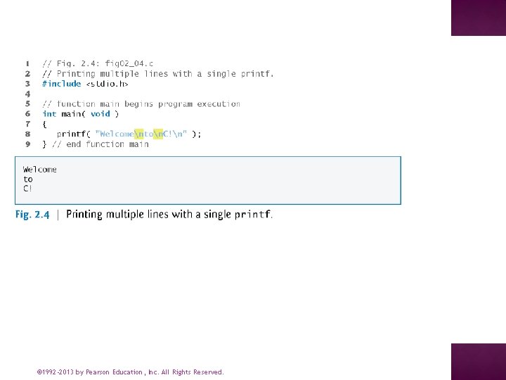 2. 2 A SIMPLE C PROGRAM: (Cont. ) � One printf can print several lines by using additional newline characters as in Fig. 2. 4. � Each time the n (newline) escape sequence is encountered, output continues at the beginning of the next line. © 1992 -2013 by Pearson Education, Inc. All Rights Reserved.