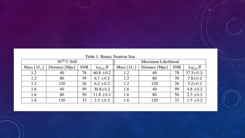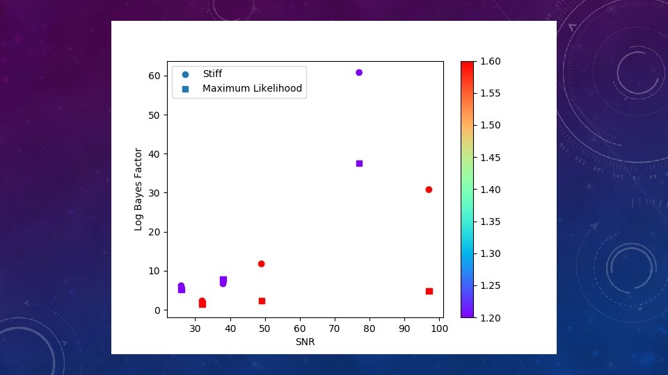 BASIC APPROACH • Make a series of injections of neutron star containing systems • Different distances, masses, and equations of state • For each injection, parameter estimation is done twice • Once with ’neutron star’ model (Non-zero tidal deformability) • Once with ‘binary black hole’ model (Zero tidal deformability) • Bayesian statistics generate posteriors and calculate evidence • Look at the Bayes Factor of Neutron Star hypothesis/ Binary Black hole hypothesis