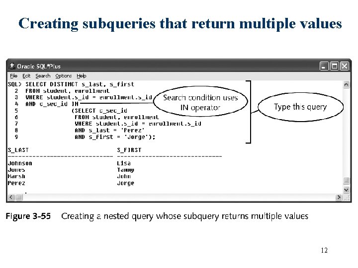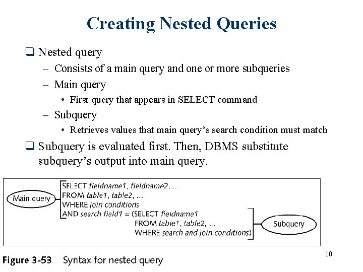 Creating Nested Queries q Nested query – Consists of a main query and one or more subqueries – Main query • First query that appears in SELECT command – Subquery • Retrieves values that main query’s search condition must match q Subquery is evaluated first. Then, DBMS substitute subquery’s output into main query. 10