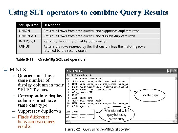 Using SET operators to combine Query Results q UNION – Queries must have same number of display column in their SELECT clause – Corresponding display columns must have same data type Note: S_LAST, S_FIRST, S_PHONE used as display title even though there are faculty members names displayed along with students. 14