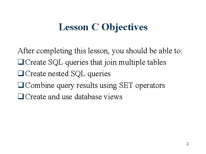 Lesson C Objectives After completing this lesson, you should be able to: q Create SQL queries that join multiple tables q Create nested SQL queries q Combine query results using SET operators q Create and use database views 2