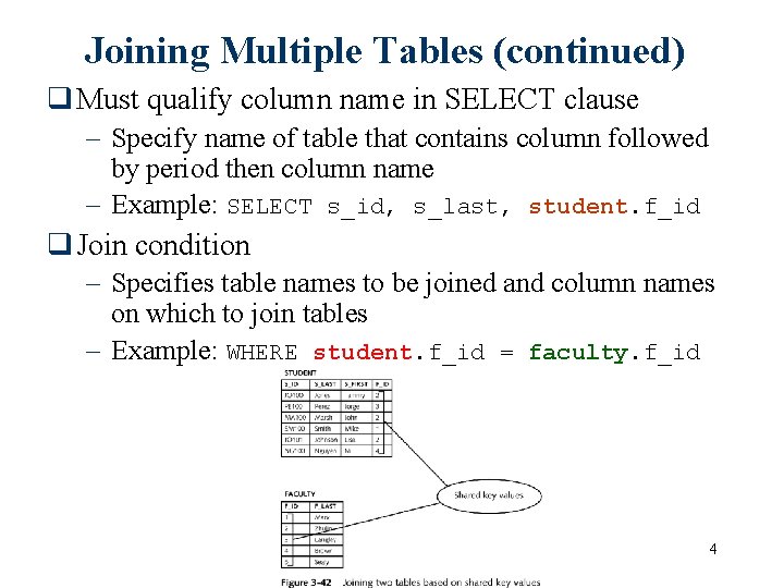 Joining Multiple Tables q a Join – Combines data from multiple tables using foreign key references q Syntax SELECT column 1, column 2, … FROM table 1, table 2 WHERE table 1. joincolumn = table 2. joincolumn AND search_condition(s); SELECT s_id, s_last, f_last FROM student, faculty WHERE student. f_id = faculty. f_id AND f_last IN (‘Marx’, ‘Zhulin’); 3
